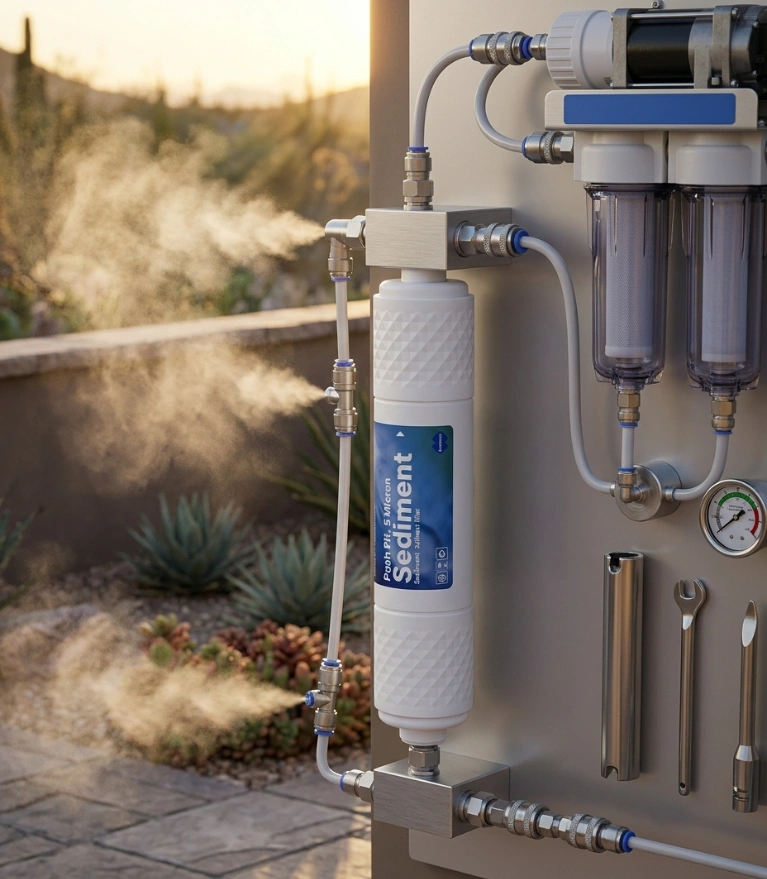 Premium quality inline sediment water filter with 1/4 inch quick connects fittings – specifically designed to protect outdoor misting and fogging systems from dirt, sand, rust, and sediment. Features a PP cotton filter media, tool-free installation, and universal 1/4 inch quick connect compatibility with all Ultra Cool Mist misting kits and standard misting systems across India. Prevents nozzle clogging and extends the life of your entire misting system significantly.